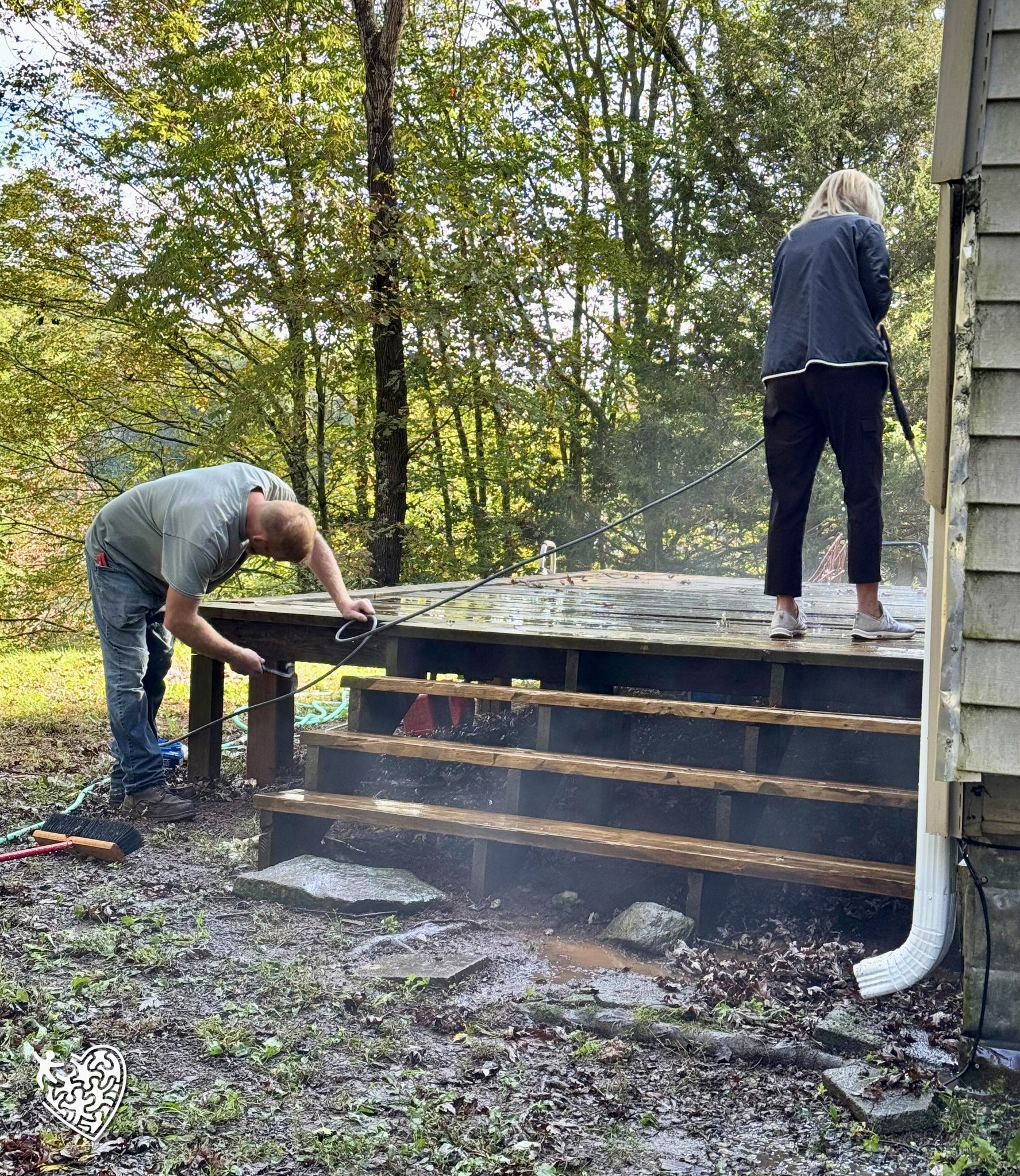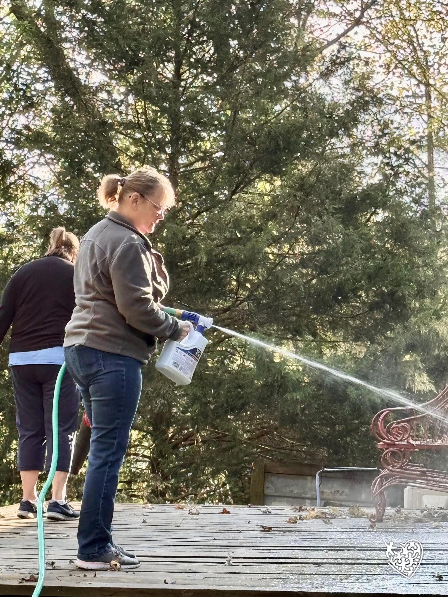 The team enjoyed pressure washing the deck and roof, fixing old deck boards and cleaning her windows. The team previously replaced the roof and weatherized the home.